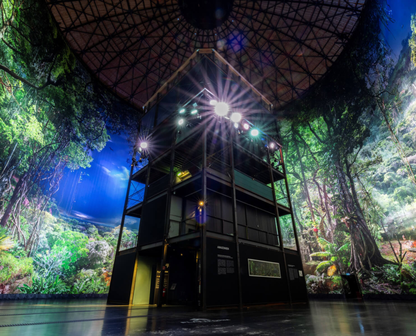 Mit AMAZONIEN hat Yadegar Asisi einen hyperrealistischen Kunstraum geschaffen, der verschiedenste geologische Formationen des tropischen Regenwalds in ihrer Komplexität verdichtet. Im zylindrischen Panorama erschließen sich Bergregenwälder und Flussniederungen, Lichtungen und Gewässer, Baumriesen oder ein sich öffnendes Tal. Aus der Dichte des grünen Kosmos treten bei längerer Betrachtung verschiedenste exotische Bewohner des Naturraumes ins Sichtfeld: zum Beispiel fleischfressende Pflanzen in leuchtenden Farben, Kolonien von Riesenameisen oder die indigene Bevölkerung bei der Jagd.